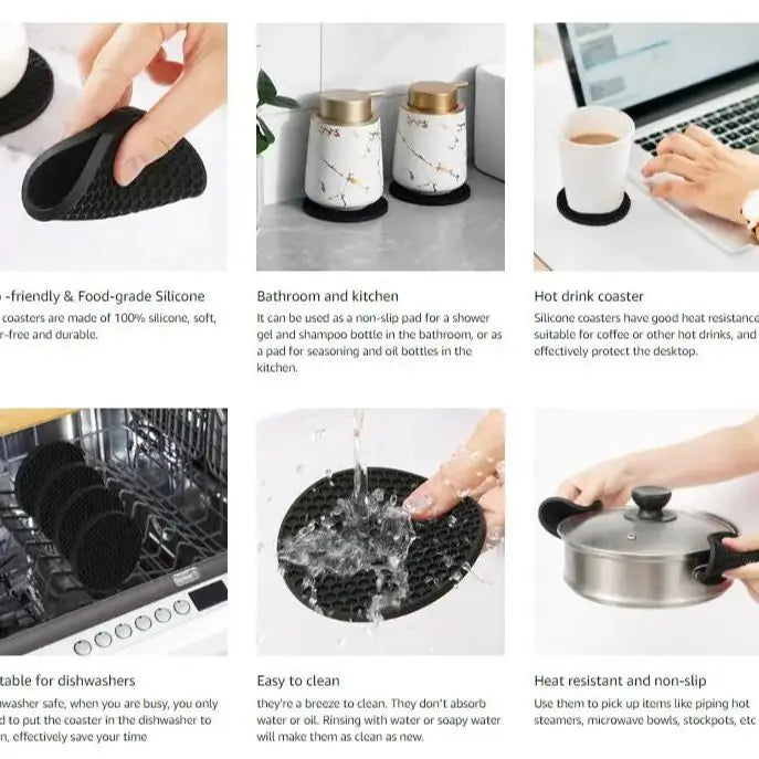 Schützen Sie Ihre Oberflächen effektiv mit diesem vielseitigen Silikon-Untersetzer-Set. Ideal für Zuhause und Büro, es bewahrt Ihre Tische vor Flecken und Rändern.