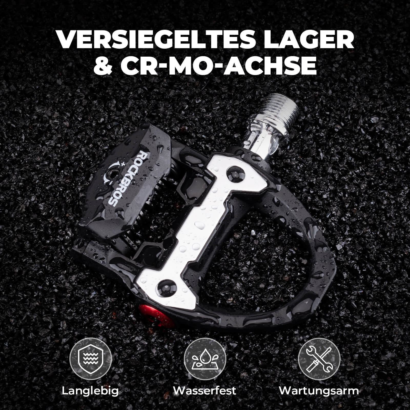 ROCKBROS Robuste SPD-Pedale mit CRMO-Stahlachse, gedichteten Lagern und Nylonkörper. Einstellbare Spannung, effiziente Kraftübertragung, Cleats inklusive.