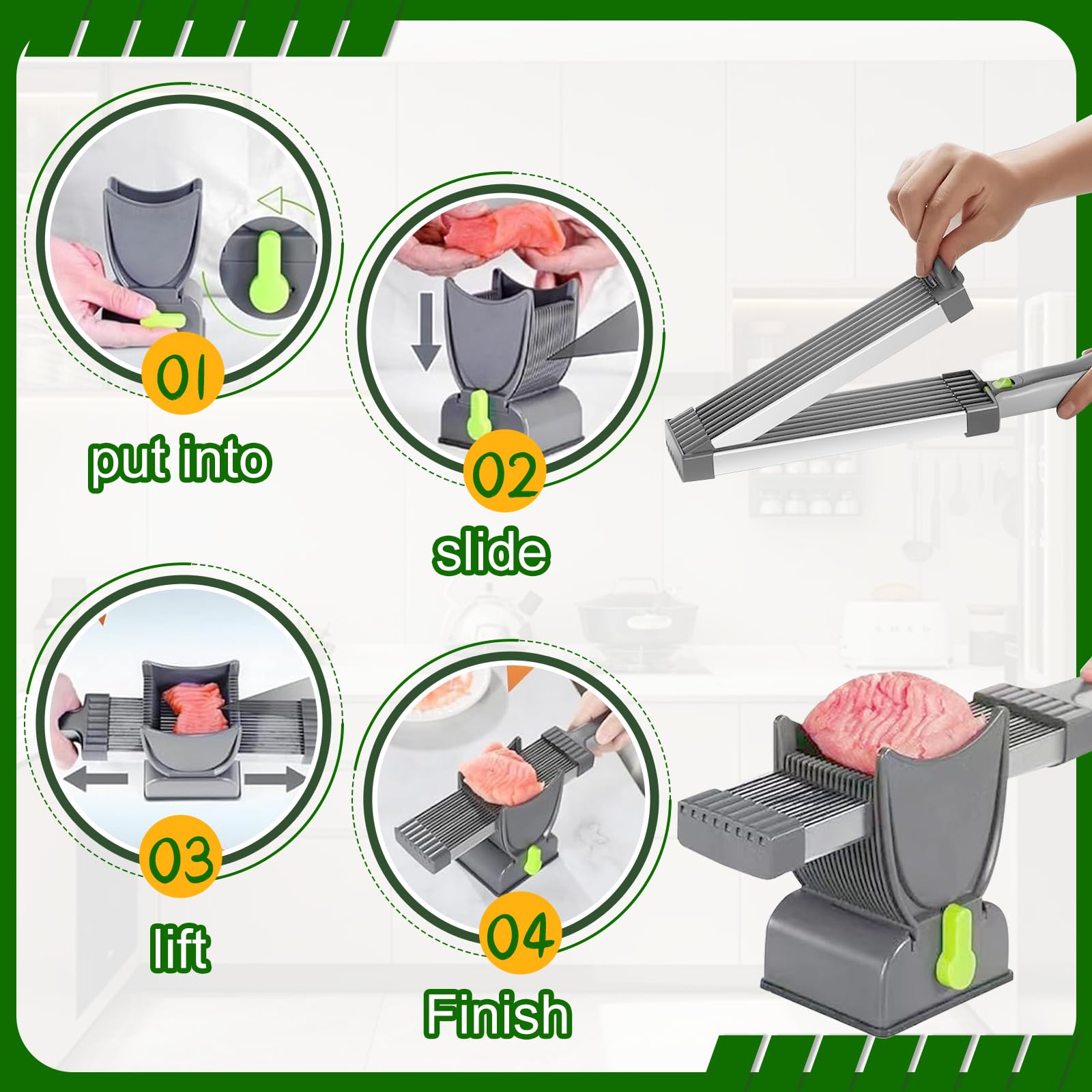 Dieses Produkt besticht durch sein Design aus Edelstahl und kompakter Bauweise, die Ihnen das Schneiden erleichtert und Ihre Küche optimal ergänzt. Es ist ideal für die Zubereitung von Zutaten für Eintöpfe, Grillspieße und den täglichen Gebrauch.