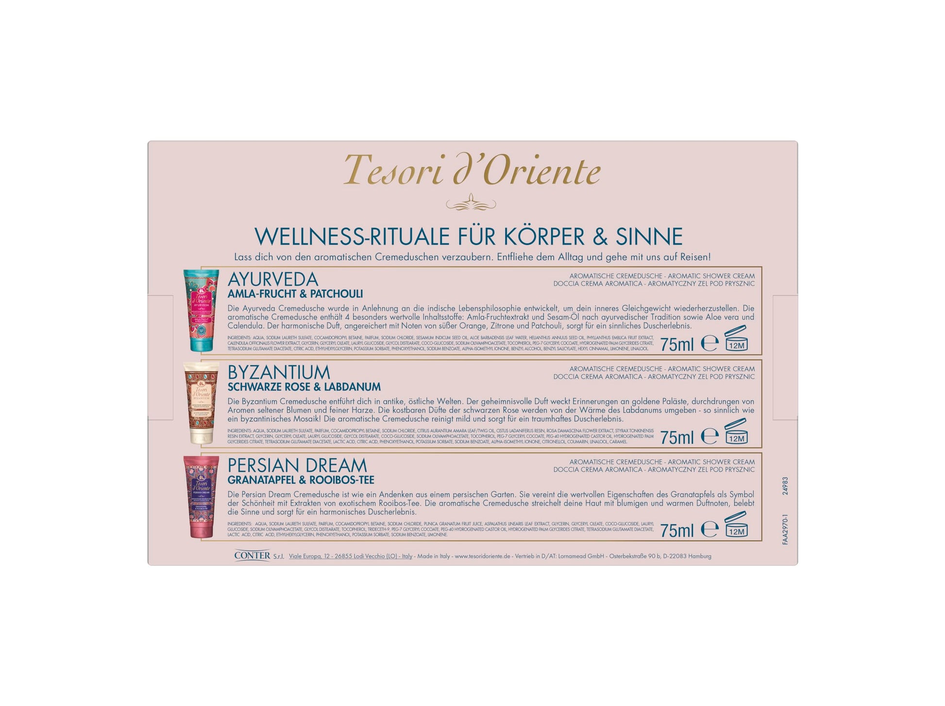 Erleben Sie die magischen Duftwelten fernöstlicher und antiker Kulturen mit diesem exklusiven Cremeduschen Geschenkset. Die drei verschiedenen Duschgele laden Sie ein, sich auf eine entspannende Reise zu begeben und Körper sowie Sinne zu verwöhnen. Dieses edle Set bringt die Traditionen aus Indien, Byzanz und Persien direkt in Ihr Badezimmer.