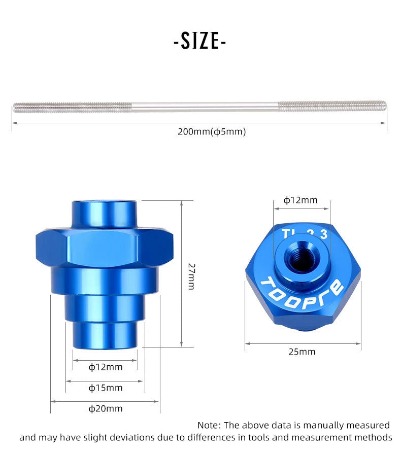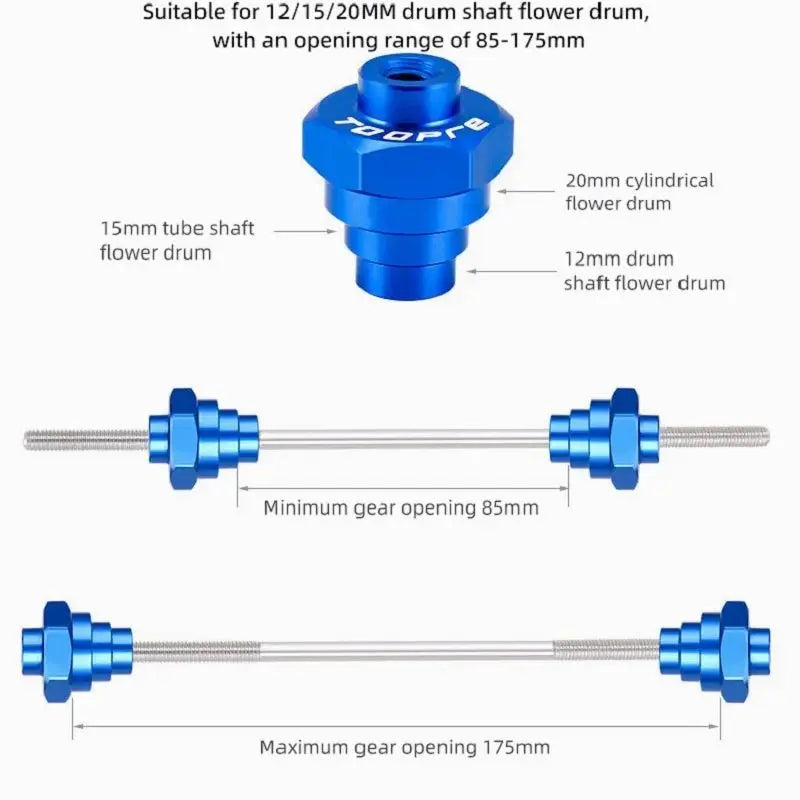 Die robuste Befestigungsstange von TOOPRE eignet sich perfekt zum sicheren Fixieren von Fahrradnaben mit 12, 15 oder 20 mm Durchmesser. Gefertigt aus hochwertiger Aluminiumlegierung und Edelstahl 304 vereint sie geringes Gewicht mit langlebiger Stabilität für präzises Radzentrieren und Trommelarbeiten.