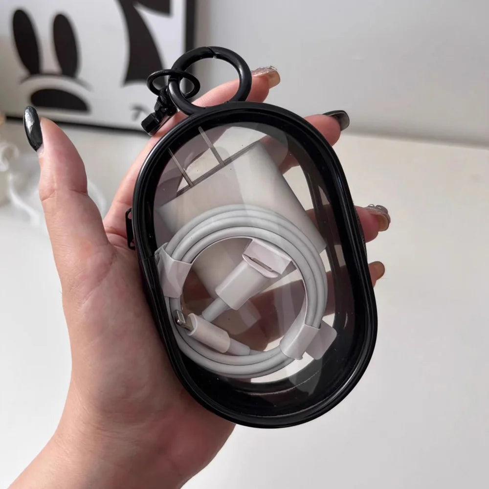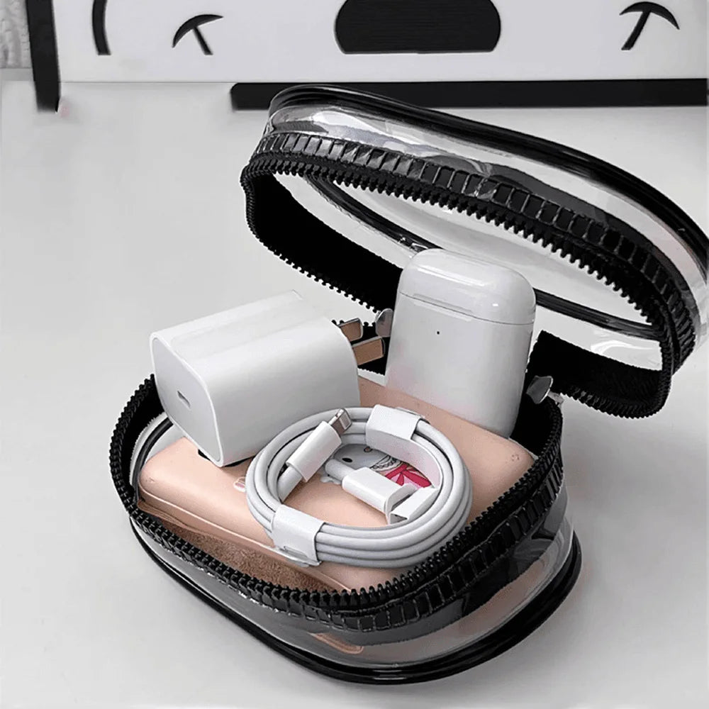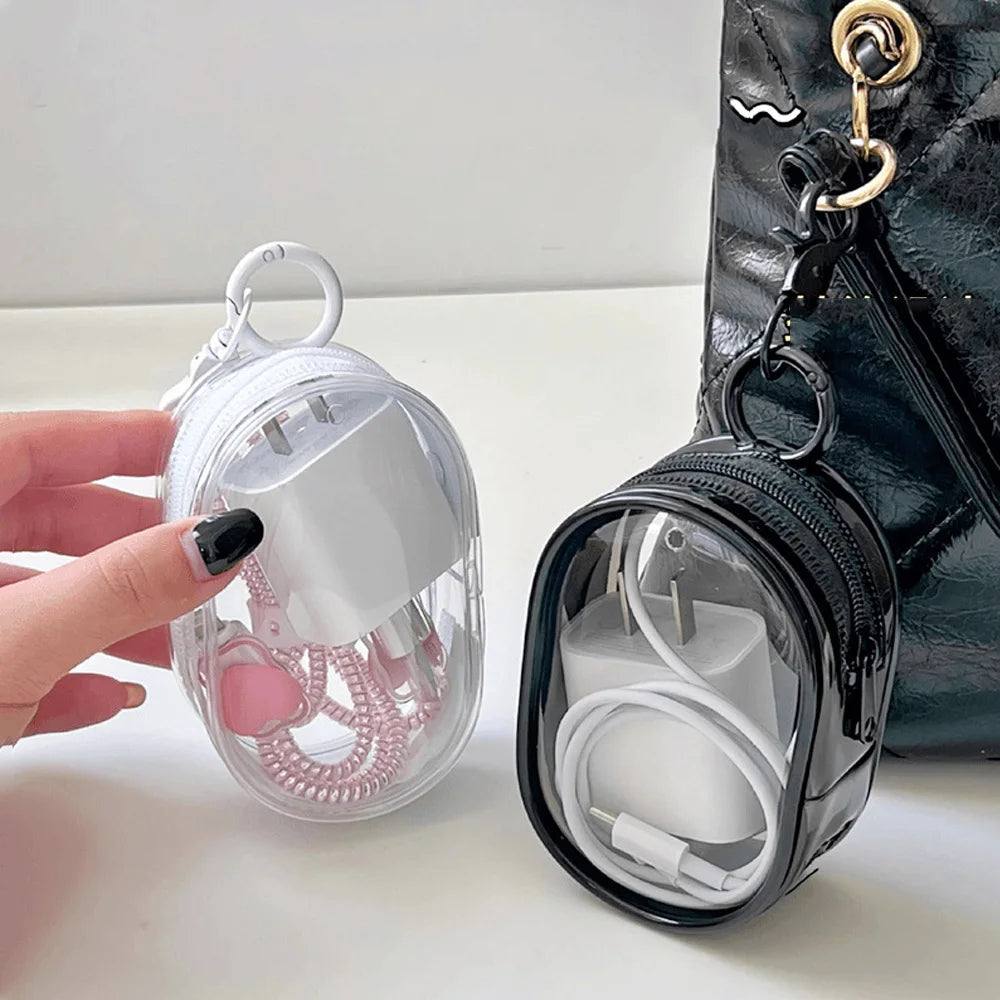 Diese tragbare Mini-Aufbewahrungstasche verfügt über einen durchsichtigen Reißverschluss und bietet ausreichend Platz für Kopfhörer, Ladegeräte und weiteres Zubehör. Die praktische Schlüsselanhänger-Schlaufe ermöglicht einfachen Transport und schnellen Zugriff.