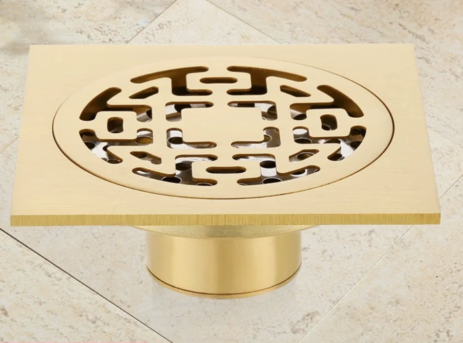 Goldfarbener Messing Bodenablauf mit quadratischem Design