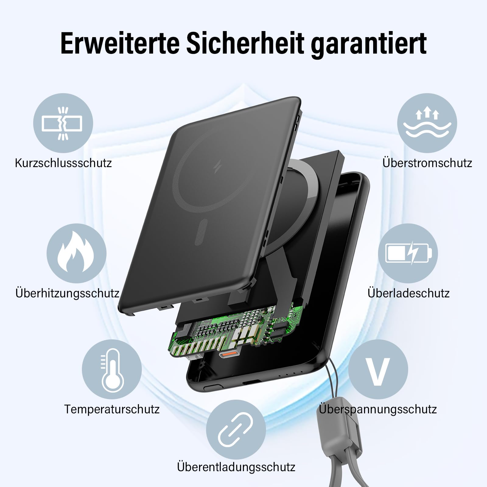 - Mehrfachschutz vor Überhitzung, Kurzschluss und Überladung für sichere Nutzung