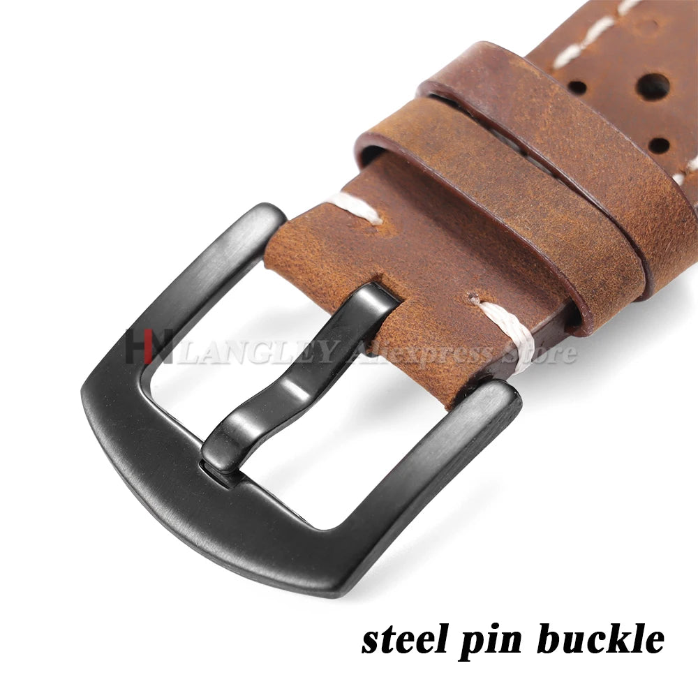 Dieses vintage handgefertigte Uhrenarmband aus Leder bietet eine klassische Optik und hohe Atmungsaktivität dank porösem Material. Es eignet sich für verschiedene Uhrentypen und Größen zwischen 18 und 24 Millimetern. Die natürlichen Farbtöne Braun, Grau und Schwarz ermöglichen vielseitige Kombinationen zu diversen Uhrengehäusen.