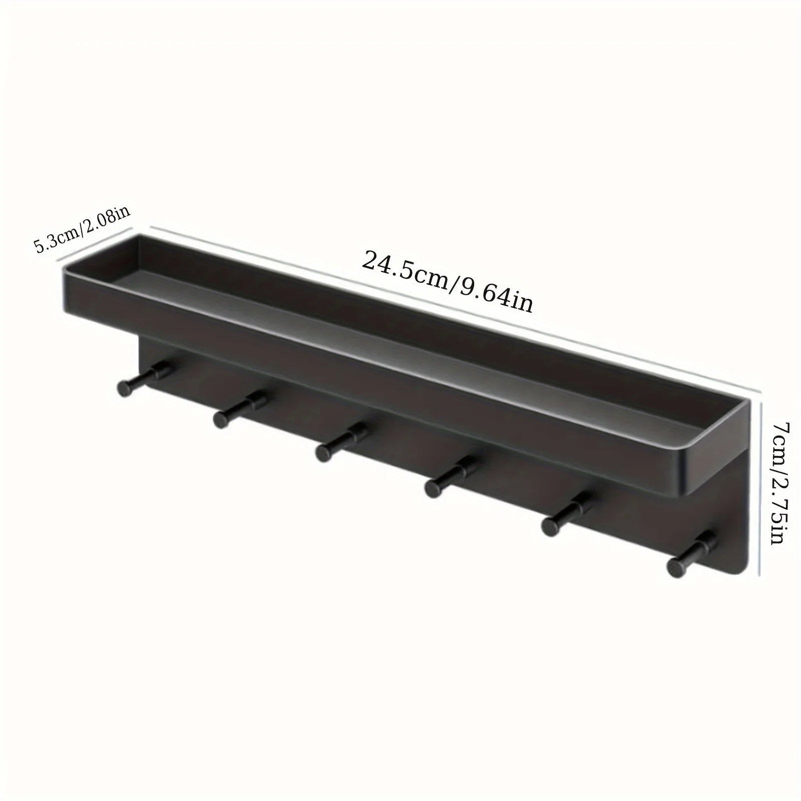Diese moderne Organisationslösung eignet sich ideal zur ordentlichen Aufbewahrung von Schlüsseln, Küchenutensilien oder Badezimmerzubehör. Das Regal bietet mit seinen sechs Haken vielseitigen Stauraum und hilft dabei, Räume aufgeräumt und gut strukturiert zu halten.