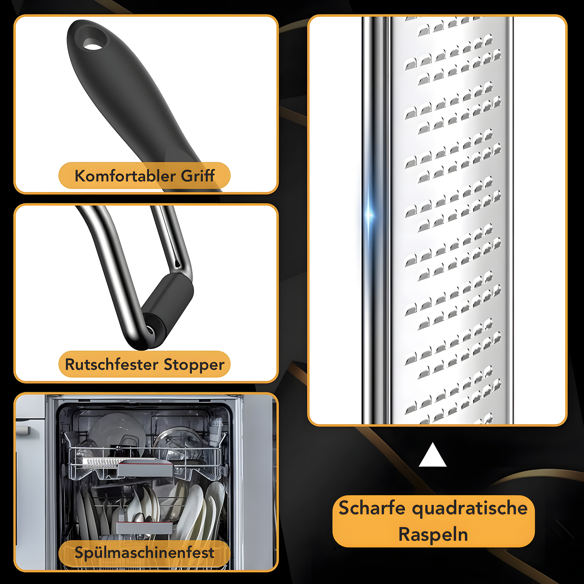 ROBUST & LANGLEBIG - LFGB-zertifiziert, rostfrei, robust und langlebig. Die Küchenreibe ist spülmaschinenfest oder leicht per Hand mit warmen Wasser abzuwaschen.